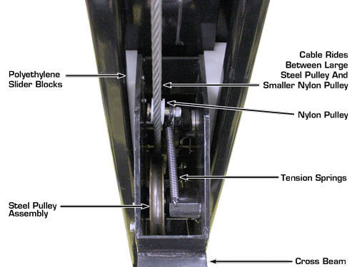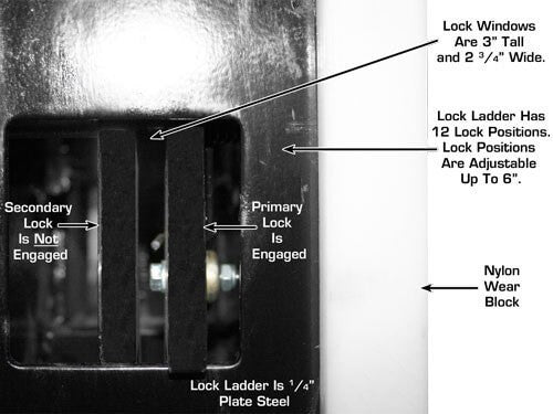 Double Lock Safety System - This Atlas Lift locking system offers a unique two position locking mechanism found only in commercial grade cable style four post lifts. The Double Lock Safety System is found exclusively on the Atlas Garage 408SL, Atlas Garage 409HP, Atlas Garage Pro 8000, the Atlas Garage Pro 9000, and the Atlas ST-7000. The Double Lock Safety System is designed to ensure that if a lifting cable becomes slack (for any reason), the secondary locking mechanism automatically engages. This Double Lock Safety System is found only on other four post above ground lifts costing hundreds of dollars more.