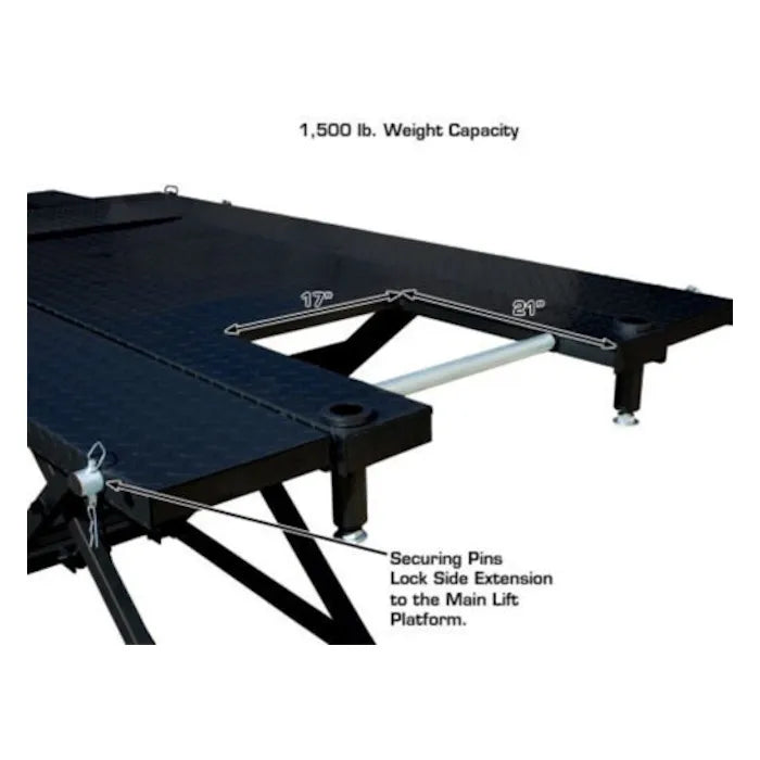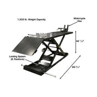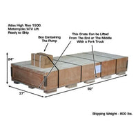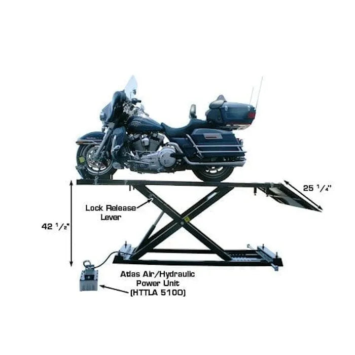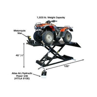 The Atlas HI-RISE 1500 Motorcycle ATV Lift is one of the industry's most popular motorcycle and ATV lifts. This lift has a manufacturer rating of 1,650 lbs. but we rate the lift at 1,500 lbs., because we always under rate our weight capacities. The HI-RISE 1500 is powered by a high quality air/hydraulic pump which is included. This lift requires 100 PSI from an outside air source (not included). The Atlas HI-RISE 1500 has an extra tall lift height of 43 inches. This increased lifting height makes it easier to work on vehicles while the operator is standing. This lift comes standard with a chopper extension making the center table 100 3/4 inches long and able to accept some of the longest choppers. The lift also comes standard with a side extension kit, with an overall table width of 51 1/8 inches, and is able to easily lift ATVs, UTVs, Golf Carts, Lawnmowers and other four wheel vehicles. The HI-RISE 1500 is the perfect addition to any service department of professional motorcycle dealers or equipment service shop or even a homeowner who wants to work on bikes or ATVs in their own garage.
