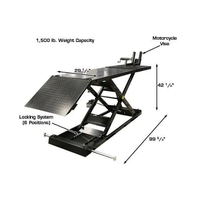 The Atlas HI-RISE 1500 Motorcycle ATV Lift is one of the industry's most popular motorcycle and ATV lifts. This lift has a manufacturer rating of 1,650 lbs. but we rate the lift at 1,500 lbs., because we always under rate our weight capacities. The HI-RISE 1500 is powered by a high quality air/hydraulic pump which is included. This lift requires 100 PSI from an outside air source (not included). This is a complete motorcycle/ATV lift and includes an adjustable front padded wheel vise, removeable rear drop out section, chopper extension, and four retractable casters.