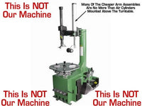 The Atlas LHA Left-Hand Assist Arm is designed to be mounted on the Atlas TC289, Atlas TC229, Atlas TC221, and Atlas TC755 wheel clamp tire changers. The pneumatic powered LH assist arm is a must have accessory to mount and demount many of the stiff sidewall tires found on today's vehicles. This Atlas LHA Left Hand Assist Arm provides robotic power, allowing the operator to keep both hands free during the tire changing operation. The disc and rotating press arm exert an enormous amount of pressure on the sidewall of the tire so the operator can mount or demount a stiff sidewall tire. The pneumatic power cylinder produces sufficient power to allow the properly positioned pressure disc to exert both upward and downward pressure (depending if you are mounting or demounting) on the sidewall of the tire. You must exert enough (upward or downward) pressure on the tire's sidewall to effectively move the bead of the tire close to the center of the rim. Many of the cheaper arm assemblies are no more than an air cylinder mounted above the turntable. These low cost air cylinder arm assemblies exert only a minimal amount of downward pressure. This downward pressure is needed for mounting the tire on the wheel, but is ineffective when you need to dismount the tire from the wheel. The lifting disc of the Atlas® LH assist arm exerts an enormous amount of controlled pressure to gently force the lower bead up into the wheel cavity, so that the tire can be removed. The bead is held below the lip of the rim by the rotating bead press adapter as the tire is being mounted.