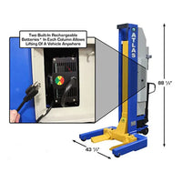 Battery power lasts 10-20 lifts depending on load and is recharged with attached 110V Single (1) phase cord. Two industrial grade deep cycle gel batteries are included for each column and has an auto charge feature for fast battery recharging. Optional Tripod Support Stands can be used to support vehicles for wheel service. THIS PRODUCT DROP SHIPS FROM THE MANUFACTURER.