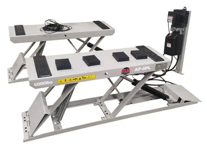 The Atlas Platinum AP-6PL 6,000 lb. low rise pit lift is ideal for quick service work situations involving tire and brake work. The 6PL comes with non-slip pads that provide a great contact surface and a set of four high density rubber blocks that help protect lifting points on most vehicles. When looking for automotive equipment that combines the best value and quality, Atlas lifts and garage equipment should be your first choice.