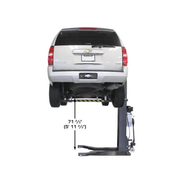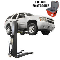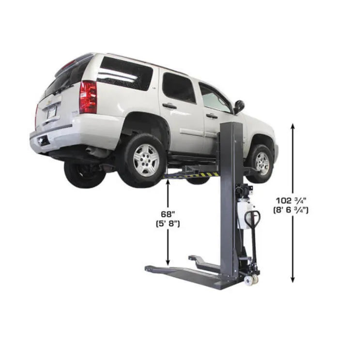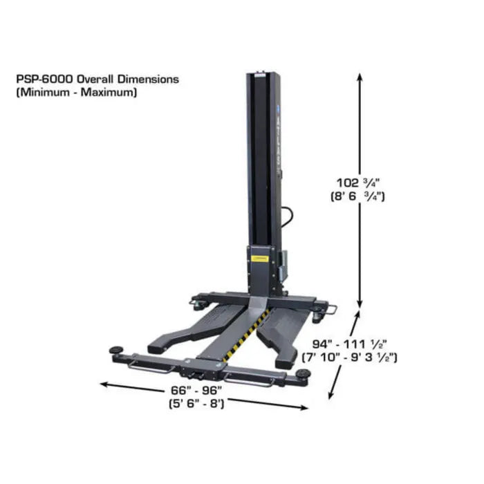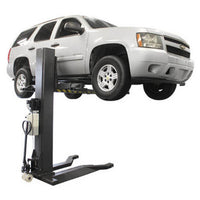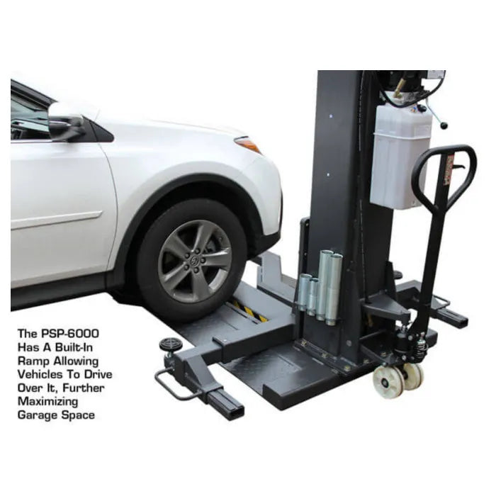 The Atlas PSP-6000 Portable Single Post Lift is the perfect choice for the commercial service shop or the Mr. Homeowner who does not want to tie up a bay space with a permanently mounted above ground lift. This portable vehicle lift allows the operator to walk under the vehicle or move around the vehicle to perform wheel service. When the Atlas PSP-6000 is not in use, it may be rolled out of the way into a corner. The PSP-6000 also has a built-in ramp allowing vehicles to drive over it, further maximizing garage space. The Portable Single Post Lift rolls easily on a level concrete surface and can be used either inside or outside of your garage. The column fits under a 9 foot (108 inch) ceiling and allows the operator to raise most vehicles high enough to access many parts of the vehicle that would not be accessible with a mid-rise lift.