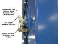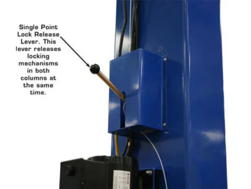 This Atlas Lift has a manual single point lock release that allows the operator to release all the safety locks at one time. The spring loaded lock handle and power unit dump valve must be activated at the same time. (two hand operation) If the lock handle is released and the dump valve handle is still being pressed, the lift will continue to descend and all locks will automatically re-engage at the next lower lock point.