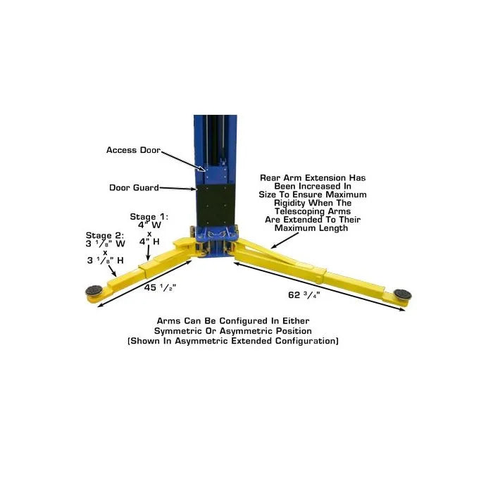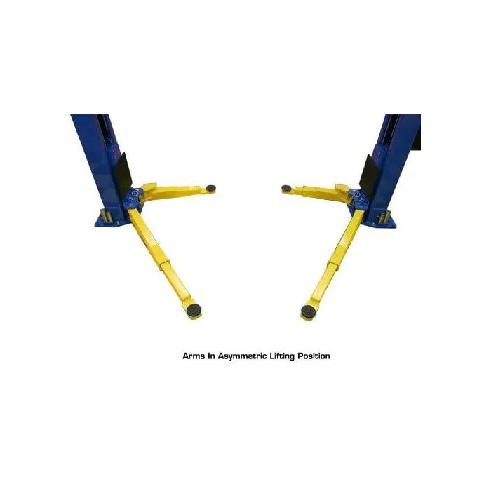 This lift has symmetrical columns and includes a set of EZ-metric arms. These arms can be configured into the symmetrical position to lift a full loaded pick up truck OR these arms can be configured to the asymmetric position to offer easier opening of the front door on some vehicles.