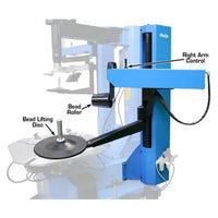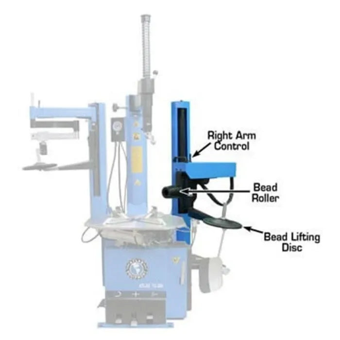 The Atlas Right-Hand Assist Arm for 700 Series Tilt-Back Tire Changers has a separate toggle control valve that allows the operator to position the arm assembly to the correct height and then move the attachments (up or down) by applying air pressure and forcing the stiff sidewall part of the tire either on the rim or off the rim. The Atlas Right-Hand Assist Arm is the perfect complement to the Atlas LHA when you need to change extremely stiff sidewall and run flat tires.