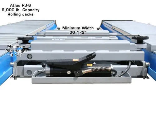 The Atlas RJ-6 rolling jack is the perfect accessory for either the Atlas 12AWFSL or Atlas 12ASL alignment racks. The Atlas RJ-6 (6,000 lbs. capacity) air/hydraulic rolling jack may also be used on competitive scissor lifts and four post lifts that have welded rails on the inside of the runways.