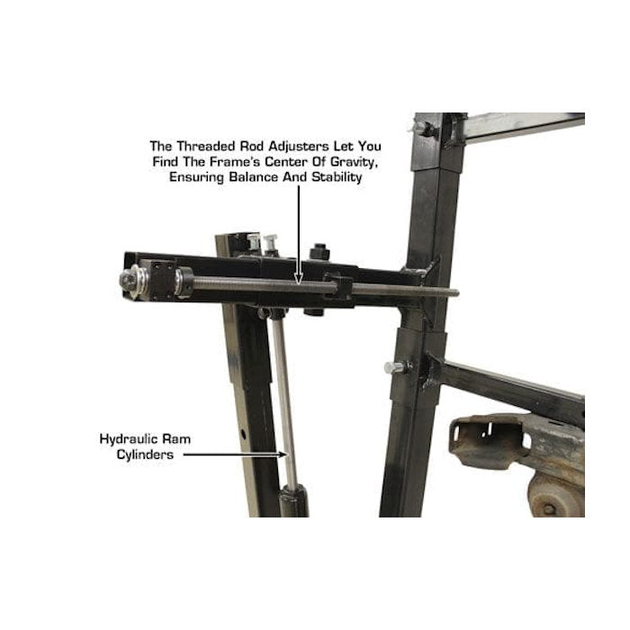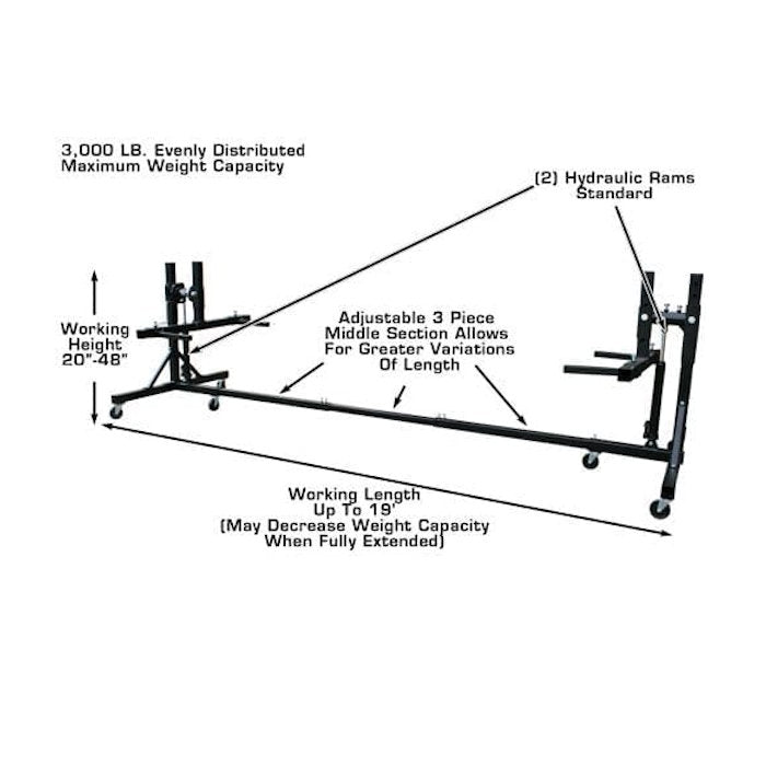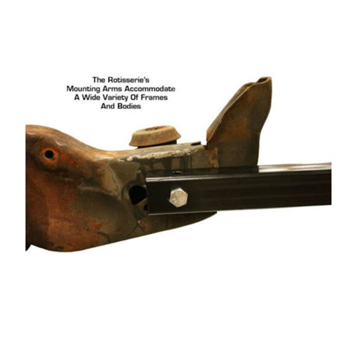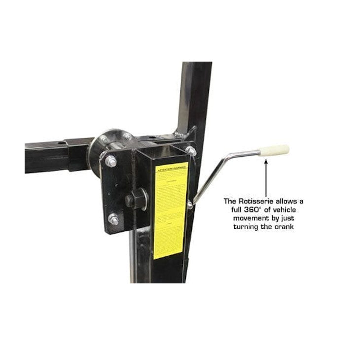 The two hydraulic rams also make it easier to mount an auto body; lifting the body or frame straight from jack stands to the desired working height removing the need for any other equipment. The rotisserie is also easy to roll because of the three (3) swivel caster wheels on each end. This versatile auto rotisserie is a must have for any hobbyist or professional restorer.