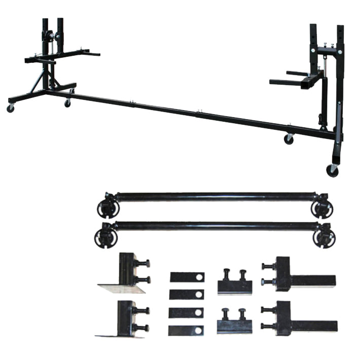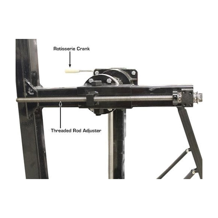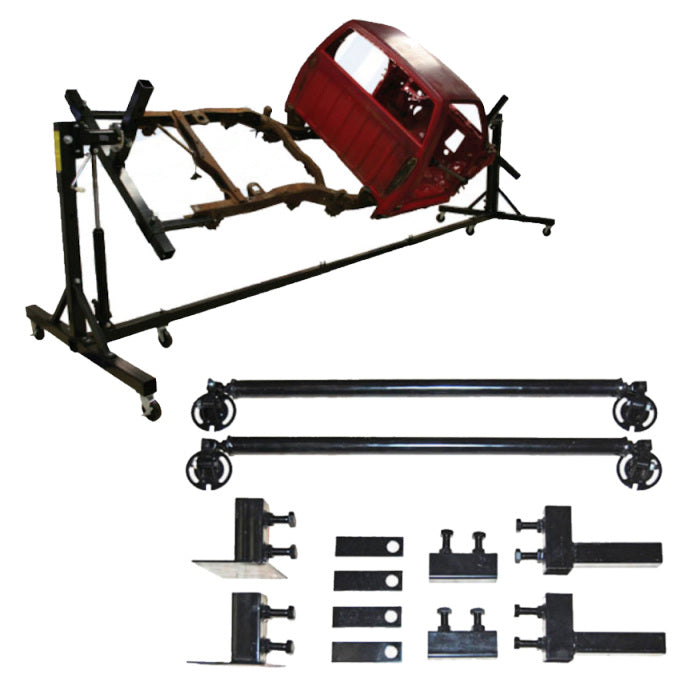 The Atlas SPINS (Simple Position In Seconds) Auto Body Rotisserie is great for anyone wanting to restore a car or truck body or frame. The rotisserie allows a full 360° of vehicle movement by just turning the crank. When the vehicle is properly mounted and positioned, the Auto SPINS allows the operator to have easy access to all parts of the body for welding, sandblasting, or any other work that needs to be done. This unit is adjustable not only in width and length, but with two hydraulic rams, is also adjustable in height. The two hydraulic rams make it easy to mount and lift the vehicle so that it can be rotated into the proper position. And the new threaded rod adjusters let you find the frame's center of gravity, ensuring balance and stability. Specialty Adapter Kit includes (2) Universal Door Bars, (2) Leaf Spring Adapters, (2) Unibody Adapters, (2) Valance Adapters and (4) Adapter Mounting Plates.
