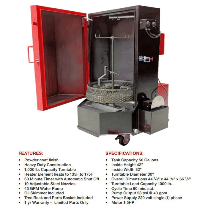 The Atlas STW-500 Spray Wash Cabinet is the ideal parts washer for any automotive repair shop. The 1,000 lbs. capacity turntable is strong enough for any size auto or light truck engine. The cut-away sides under the door allow you to wheel your engine crane right over the table for easy loading and unloading. 19 high pressure spray jets quickly clean the greasiest engine components whether they are on the turntable, hanging from the parts tree or in the standard parts basket. The 60-minute timer means the washer can be left unsupervised so your mechanic can go on to the next job while the washer is running. When he gets back the parts are clean and dry within seconds of unloading. The parts washer requires no harmful solvents using only hot water and biodegradable detergents for an environmentally safe operation. The standard stainless steel skimming disc extends the life of your cleaning solution.