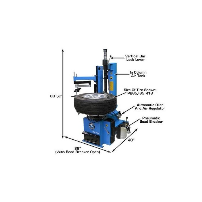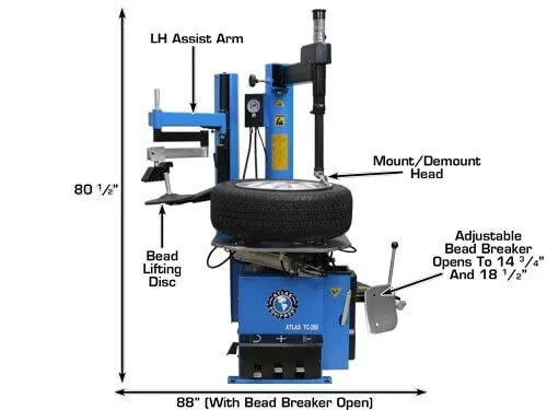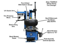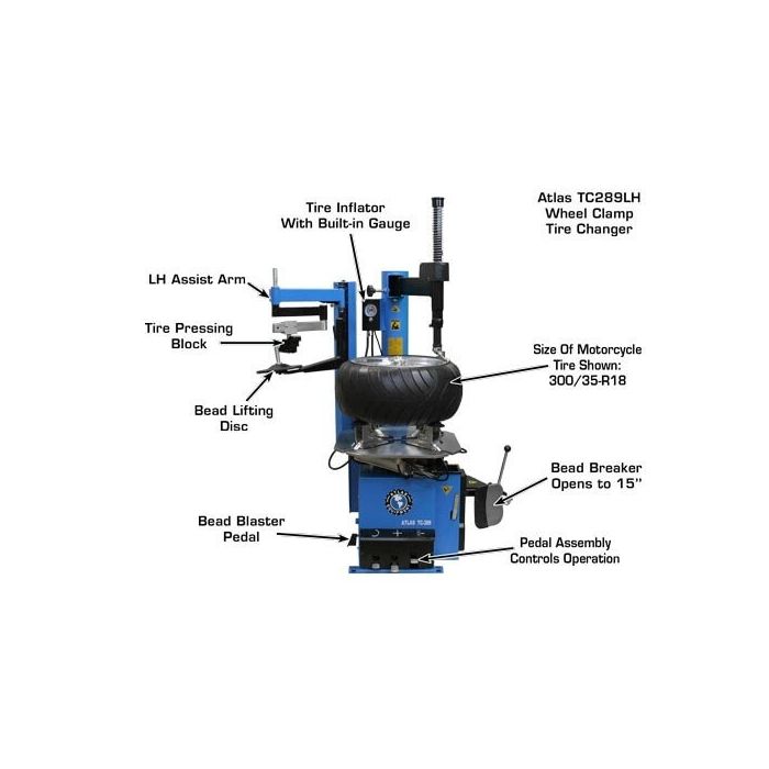 The Atlas TC289LH is the perfect wheel clamp tire changer for most general automotive service departments and medium to large sized tire stores. The Atlas TC289LH wheel clamp tire changer is capable of changing the majority of the expensive alloy and custom wheels found on today's vehicles.
