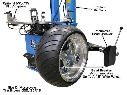 The use of Atlas Motorcycle/ATV Flip Adapters prevent the use of the air bead blast feature on this tire changer. The adapters are slid over the standard wheel clamp jaws on the tire changer table and will block the holes through which the bead blast shoots the jets of air. This means that you will not be able to use the Bead Blaster to help you reseat the bead of a tire when you are using either of these adapter sets.