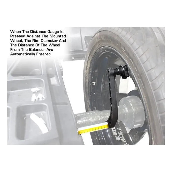 The "split-weight" feature allows the operator to "split" the correct amount of weight and "hide" these weights behind the spokes. The measuring guide rod is used to pinpoint the placement of the weights and the WB49's software determines the amount of weight that needs to be applied.