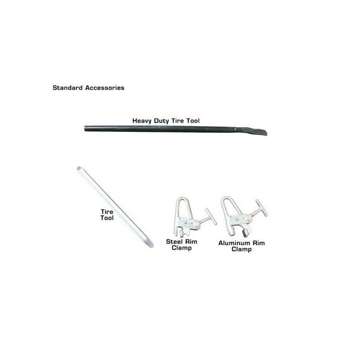 The Atlas Truck Tire Changer includes a tire tool, a heavy duty tire tool, a set of steel rim clamp pliers, a special set of pliers for use with alloy rims, and a full set of alloy rim protectors and plastic protective covers to prevent damage to decorative chrome rims.