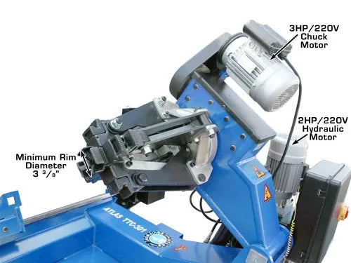 The powerful chuck 220 volt (+/- 5%, so 209-231 volts) single (1) phase motor and sophisticated hydraulic system delivers extraordinary torque and power to the Atlas TTC 303 truck tire changer. The 220 volt single (1) phase motor is the perfect choice for those tire stores where three (3) phase electricity is not available.