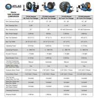 The Atlas TTC301 Heavy-Duty Truck Tire Changer is designed and engineered to handle rim sizes from 13" to 27" and tire diameters in excess of 63". The Atlas TTC301 truck tire changer can easily accommodate tires with a maximum width of 30.5". This tire changer has been sold all over the world for the last several years and is the result of a joint venture between a very prestigious Italian wheel service manufacturer and the premier wheel service equipment manufacturer in Asia.