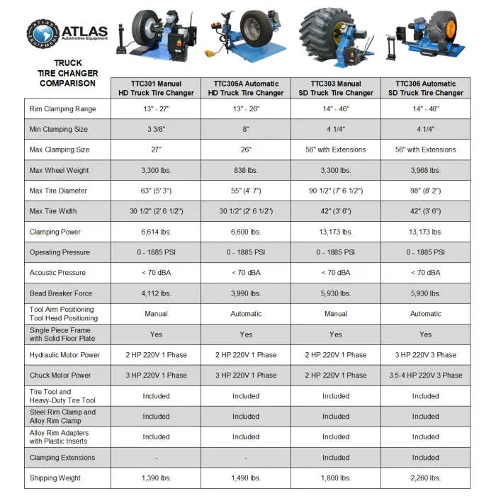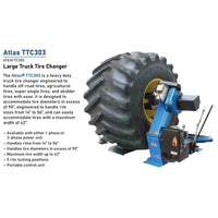 The Atlas TTC303 Super-Duty Truck Tire Changer is the perfect choice for the large truck tire center that does high volume truck tire work on standard over the road wheel assemblies and demands the capabilities to change agricultural and off road wheel assemblies with dependability and durability in their equipment.