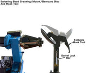 The bead breaker disc and the mount/demount head are combined into one quick change assembly on an adjustable two-position carriage to make the mounting, demounting, and bead breaking procedures very easy.