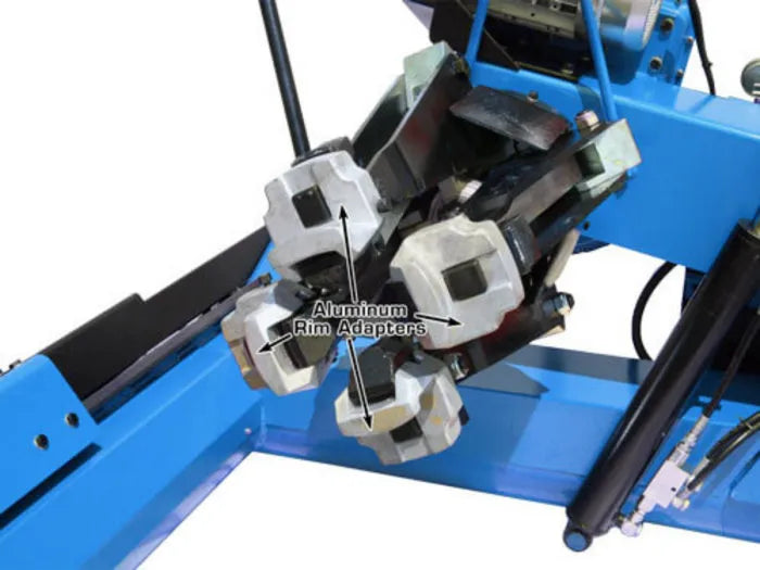 The Atlas TTC-301 truck tire changer features an electric/hydraulic operated self-centering four jaw chuck that can clamp from either the inside of the wheel or from the center bore of the wheel.