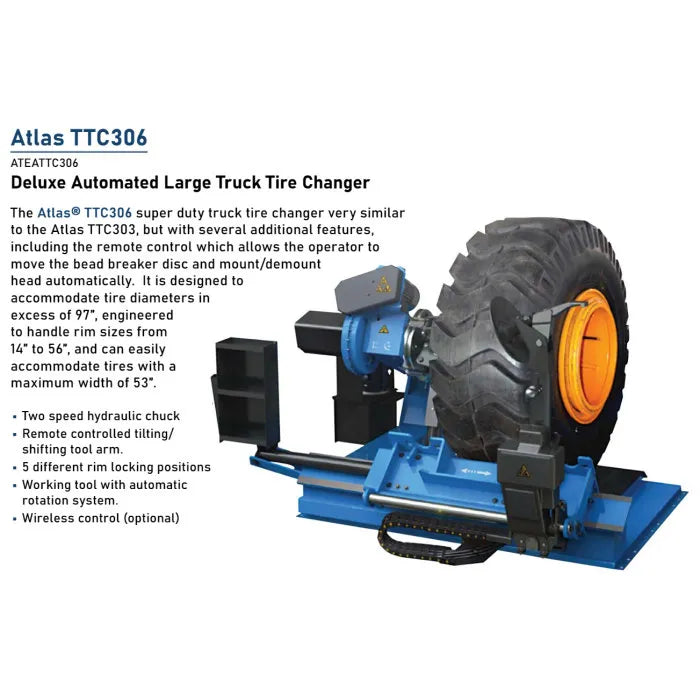 The Atlas TTC306 Deluxe Automated Truck Tire Changer is very similar to the Atlas TTC303, but with several additional features. The remote control allows the operator to move the bead breaker disc and mount/demount head automatically. This Super Duty Atlas truck tire changer is designed and engineered to handle rim sizes from 14" to 56" and tire diameters in excess of over 97". The Atlas TTC306 Truck Tire Changer can easily accommodate tires with a maximum width of up to 53". This is the perfect tire changer for those companies that need the extra capacity to change large agricultural and earthmover tires. The Deluxe TTC306 has identical features of those truck tire changers costing over $20,000.