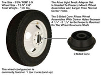 The Atlas WB-LTA Large Truck Adapter Set is a two piece wheel balancer truck adapter set consisting of a double sided center cone for wheel centers up to 7" and a spacer to help prevent wheels from contacting the side of the balancer. Fits 40mm shafts.The Atlas large truck adapter set is needed to properly mount wheels with larger than normal center holes. The standard cone adapter set (included with all Atlas wheel balancers) will accommodate wheels with center holes of about 4-3/4" diameter. Many steel wheels found on 3/4 and 1 ton pickup trucks have larger center holes.