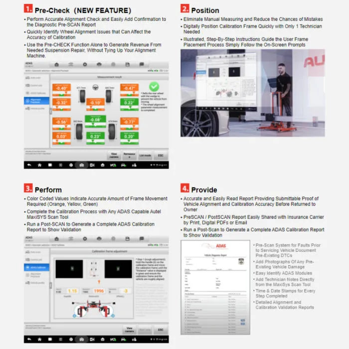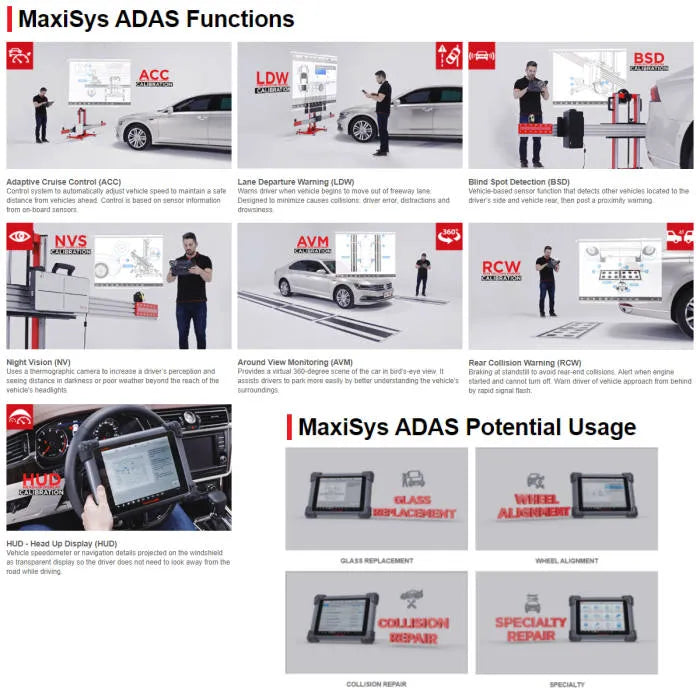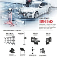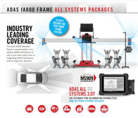 The Autel ADAS LDW30T Tablet Calibration Package is a Lane Departure Warning calibration system that includes the Autel Standard Calibration Frame, targets and patterns for Honda, Genesis, VW, Mercedes, Hyundai, Kia, Nissan, Infiniti, Mazda, Mitsubishi, Subaru, Toyota, and Lexus vehicles with LDW camera systems. Includes MaxiSYS MS909 Diagnostic Tablet with ADAS calibration software upgrade. This system includes the IA800 optical positioning package that enables rapid vehicle to target positioning and precheck of vehicle alignment. The IA800 package includes six cameras, wheel clamps and positioning targets and distance positioning stand. Includes 2- and 5-line lasers, plumb bob, laser-assisted mirror, L-shaped bracket and laser reflector. Includes One-Year Warranty.Advanced Driver Assistance System (ADAS) is becoming standard equipment on today's new vehicles. These systems are designed to assist drivers to prevent collisions by displaying alerts, providing camera images or by taking instantaneous control of the vehicle. The Autel MaxiSys ADAS provides the original complete diagnostic functionality, comprehensive and precise ADAS calibration. With MaxiSys calibration tools and accurate software, Autel MaxiSys ADAS is an ideal calibration tool for collision repair, glass replacement and repair shops.