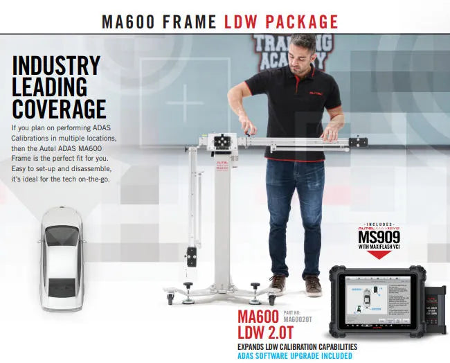 Autel ADAS MA60020T LDW2.0 Mobile Package includes the MA600 Mobile Calibration Frame, the MaxiSys MS909 Tablet, ADAS Software Upgrade for calibration of LDW systems on Alpha Romeo, Honda, Genesis, VW, Mercedes, Hyundai/Kia, Nissan, Infiniti, Mazda, Mitsubishi, Mazda, Subaru, Toyota/Lexus vehicles. Includes Pattern Board, Wheel Clamps and Laser Crossbar; Includes DIGITALADAS add-on for faster frame placement with one person; Includes LDW Target Case; Includes Target Board Holder and Includes a One-Year Limited Warranty.