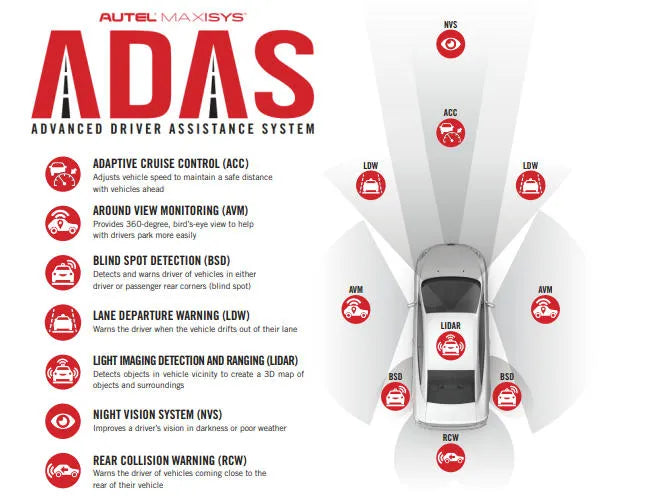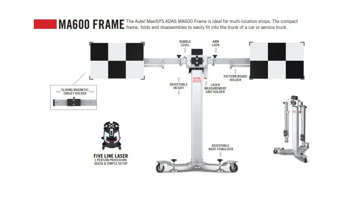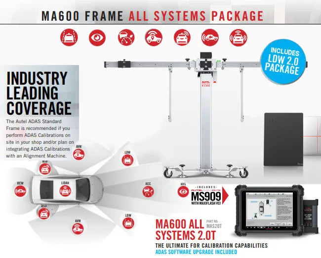 Autel ADAS MAS20T All Systems 2.0 Mobile Package includes MA600 Mobile Calibration Frame, the MaxiSys MS909 Tablet, ADAS software upgrade for calibration of LDW, ACC, Lidar, Radar, Night Vision, RCW, Lane Watch and AVM system calibrations on Alpha Romeo, Honda, Genesis, VW, Mercedes, Hyundai/Kia, Nissan, Infiniti, Mazda, Mitsubishi, Mazda, Subaru, Toyota/Lexus vehicles. Includes LDW Patterns/Targets for Alpha Romeo, Honda, VW, Mercedes, Hyundai/Kia, Nissan, Infiniti, Mazda, Mitsubishi, Mazda, Subaru, Toyota/Lexus; Includes Night Vision Calibrator Package for VW, Mercedes, GM; Includes Lidar Calibration for VW/Audi, Lexus, Toyota; Includes AVM patterns/systems for Hyundai/ Kia, Nissan, Mitsubishi, Toyota, VW, Honda, GM; Includes RCW patterns/package for VW, Nissan, Mercedes; Includes Expansion Pack for RCW, AVM, LIDAR, and NV system Calibrations; Includes Honda Lanewatch Target; Includes Pattern Board, Wheel Clamps and Laser Crossbar; Includes DIGITALADAS add-on for faster frame placement with one person; Includes LDW Target Case; Includes Target Board Holder and Includes a One-Year Limited Warranty.