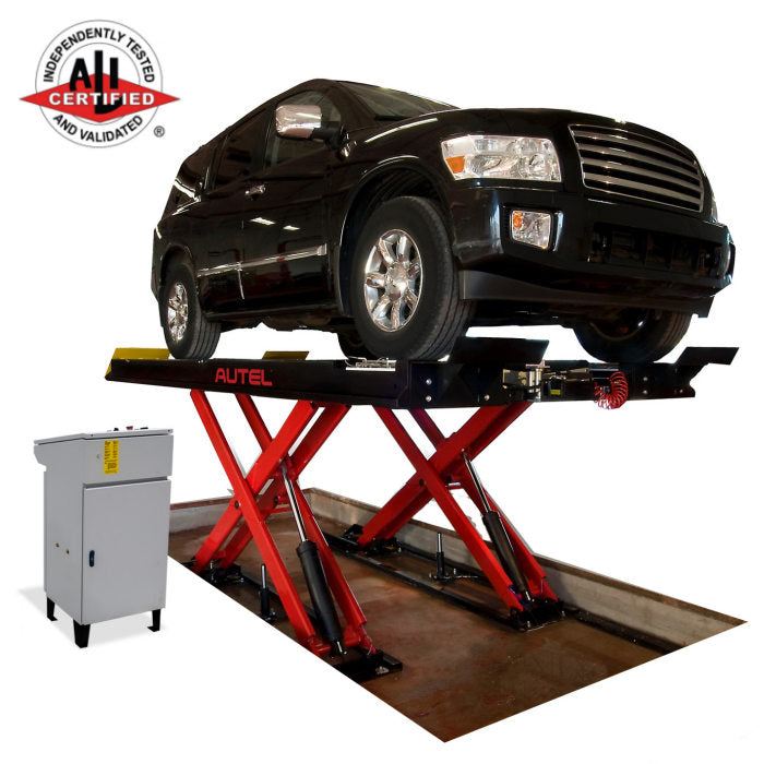 The Autel Alignment 14K Scissor Lift is a 14,000 lbs. capacity, flush-mounted hydraulic alignment scissor lift compatible with most passenger vehicles and light trucks. This premium lift includes two 7,000 lbs. capacity Jacking Beams, has front and rear opening runways with flip-down wheel stops, stainless steel air lock release for longer life and less maintenance. Double-wide runways with built-in "Z" rails are structurally stronger with no sagging or flexing for far more accurate alignments. Runways measure 203" long and 26" wide. Low angle approach ramps provide for easy access. Stainless Steel Front Radius Turn Plates and Rear Slip Plates with Turn Plate Pocket Protectors for paint protection. Built-in Runway Air Tire Inflation Kit at each wheel. Shatterproof 24-inch LED Lighting Kit with Automatic Shut Off. Enclosed Console Control Power Unit. Krown Industrial-grade Rust Proofing. Premium Double Baked Power Coat Finish. Black Finish Scissor Lift and Base. Autel logo labeled. These lifts are made in North America and ALI Certified.