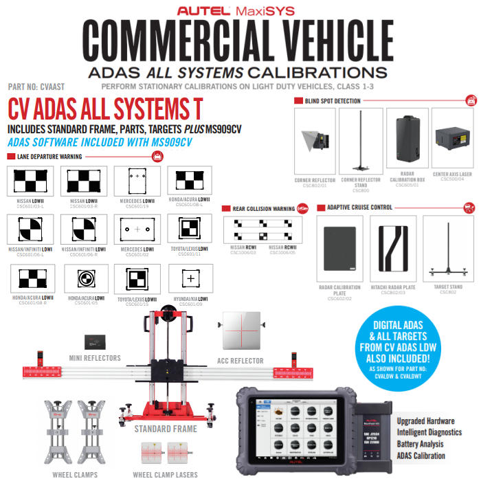 Autel CVAAST Commercial Vehicle ADAS All Systems Tablet Package includes Standard Calibration Frame, Hardware, MaxiSYS MS909CV Diagnostic Tablet with pre-installed ADAS Calibration Software for calibration of LDW, RCW, BSD, ACC, AVM system calibrations on Nissan, Infiniti, Mercedes, Honda, Acura, Hyundai, Kia, Toyota, Lexus Vehicles. Includes Pattern Board, Wheel Clamps, Vehicle Positioning Wheel Clamp Lasers, ACC Reflector, Mini Reflectors, Digital ADAS kit with (3) Digital Tape Measures, (2) Wheel Dials, and Supporting Hardware; Includes DIGITALADAS add-on for faster frame placement with one person; Nissan RCW Camera Calibration Mats, Cadillac AVM Camera Calibration Mat; Includes Target Board Holder and Includes a One-Year Limited Warranty.