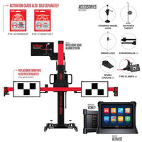 - Includes 24" touchscreen display that attaches to frame unit, four tire clamps, steering wheel and brake lock, distance target, two wheel chocks, and two AVM-placement lasers.