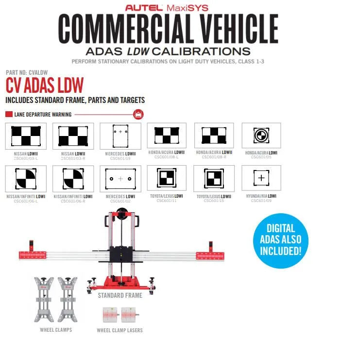 - Includes three 27" attachable monitors and the Autel digital LDW target kit.
