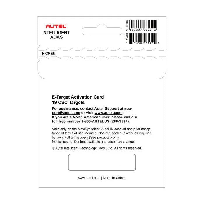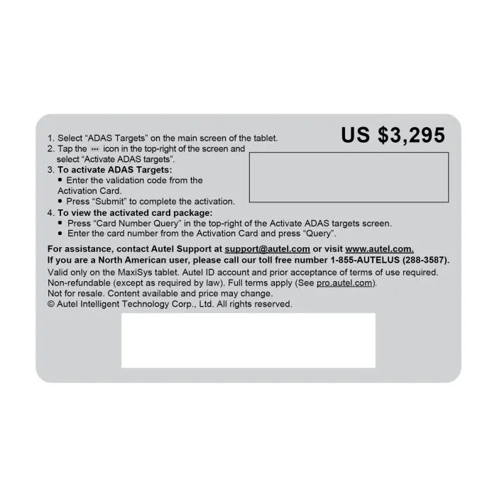 The Autel ETARGETACT Digital Targets Upgrade Card upgrades the Autel MaxiSYS ADAS IA1000 Automated Alignment and ADAS Calibration System with the LDW digital targets included in the Autel Digital Target Kit. Target patterns automatically display on the monitors attached to the IA1000 crossbar. LDW digital targets include camera calibration targets for Mercedes-Benz, Honda, Nissan, Infiniti, Toyota, Mazda, Mitsubishi, Maserati, Hyundai, Kia, and Subaru vehicles.