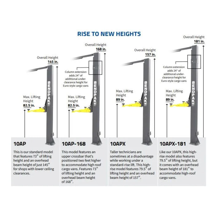 The 10AP is our standard model that features 73" of lifting height and an overhead beam height of just 145" for shops with lower ceiling clearances.
