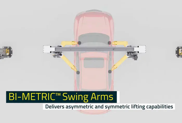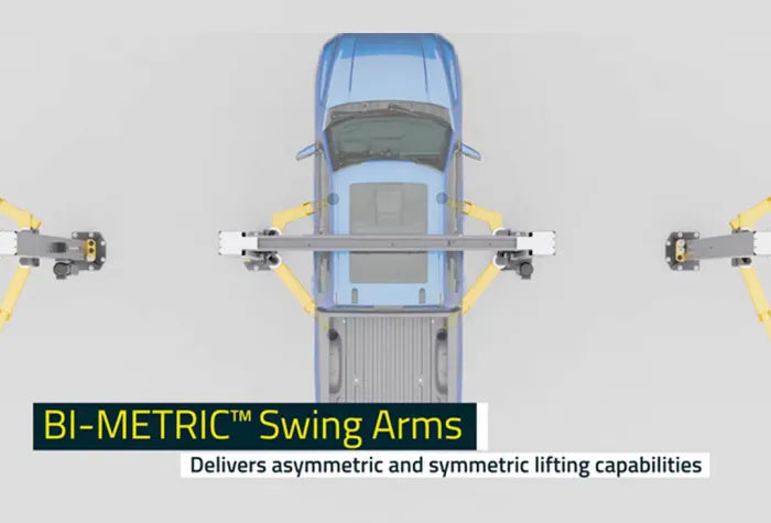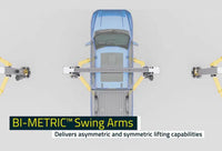 - Bi-Metric™ swing arms - give users the ability to set their lift up in either symmetric or asymmetric configurations. The 2-in-1 design gives installers and operators the option of loading vehicles either symmetrically (centerline of vehicle at column) or asymmetrically (centerline of vehicle behind column).