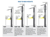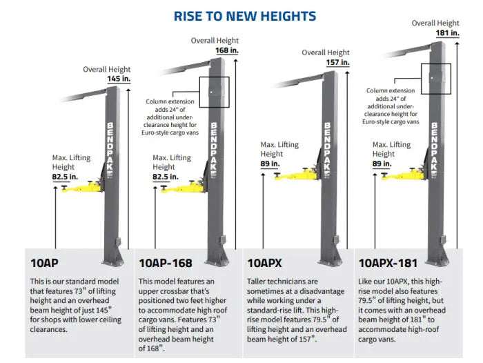 The 10APX-181 high-rise model features 79.5" of lifting height to accommodate taller technicians and it also comes with an overhead beam height of 181" to accommodate high-roof cargo vans.