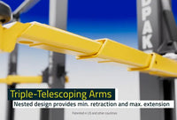 The innovative three-stage arms achieve more telescoping movement due to their patented nesting feature that results in greater retraction and farther reach. Inner sliding arm movement is no longer impeded by arm end plates, tube closeouts, or even the arm pivot pin itself. The inner tubes retract fully through the back of the arm assembly end even beyond the arm pin, resulting in more achievable retraction and extension.