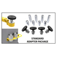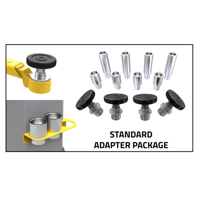 Double-telescoping screw adapters feature gouge and tear-resistant polyurethane pads that can be screwed up or down to ensure level lifting in all conditions. Provides more precise and secure frame engagement, ensuring technician safety. For greater vertical pad placement, we also offer OPTIONAL 2.5" and 5" stackable adapters for precise and safe vehicle support. The drop-in design allows for quick and easy use, and 2 column mounted racks keep the adapters neatly organized and secure.
