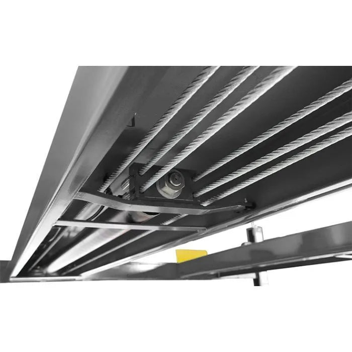 This car lift features four, 1/2" diameter, 6 x 25 stainless-steel lifting cables that have a breaking strength of over 14,000 lbs. each. This aircraft-quality cable was specifically designed for lifting applications and provides a great balance between abrasion resistance and fatigue.