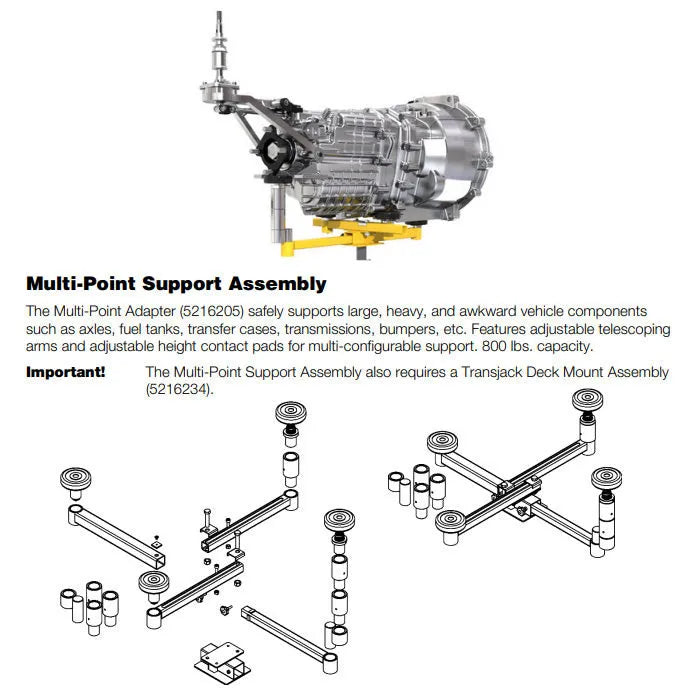 The BendPak 5216205 EVS Multi-Point Support Assembly is a 4-point adapter set that features independently adjustable indexing arms that adapt to and safely support nearly any large, heavy, and awkward vehicle components such as transmission, drivetrains, axles, fuel tanks, transfer cases, transmissions, bumpers, vehicle subframes, etc. The kit comes with four telescoping support tubes, four adjustable telescoping arms and four adjustable height contact pads for multi-configurable support with 800 lbs. capacity.