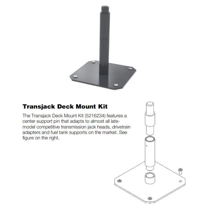 The BendPak 5216234 Universal Deck Mount Kit features a center support pin that adapts to almost all late model competitive transmission jack heads, drivetrain adapters and fuel tank supports on the market.For Use With BendPak EVS3000 and EVS4500 Lift Tables