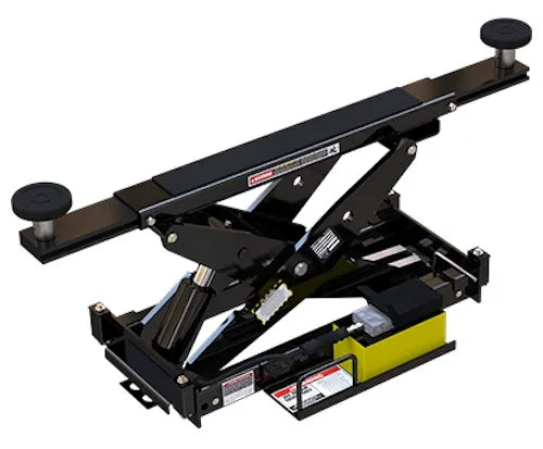 The HD-14 car lift is one of our most popular units for lifting medium-duty vehicles, as well as low-stance sports cars. Its extended approach ramps make it easy to safely engage your vehicle's wheels, but what do you do when it's time for a tire swap? Unless you want to expand your capabilities with a two-post lift, a simple pair of RBJ7000 rolling bridge jacks is necessary to lift the vehicle. (Each jack lifts half the vehicle frame.)