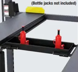 The JP45 bottle jack tray holds one or two bottle jacks (not included) that let you get a vehicle's wheels off the runways of a 4-post lift, making it easier to perform wheel and suspension work. Its telescoping arms allow to fit on most four-post lifts on the market. For Use With BendPak HD-9 And HD-7 Series Four Post Lifts