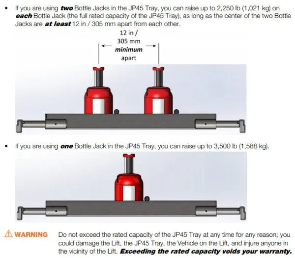 The telescoping jack tray platform is ideal for use with one or two bottle jacks, which are not included with the kit. This gives you the flexibility of choosing which bottle jack is right for your application. If using only one jack, position it in the middle of the tray and do not exceed 3,500 lbs. If using two jacks, make sure they're spaced at least 12" apart from each other and not exceed 2,250-lbs. per jack (the maximum capacity of the JP45). With the bottle jacks in position, you're able to safely lift your vehicle from the runways giving you full access to your wheels, just like a four-post bridge jack.