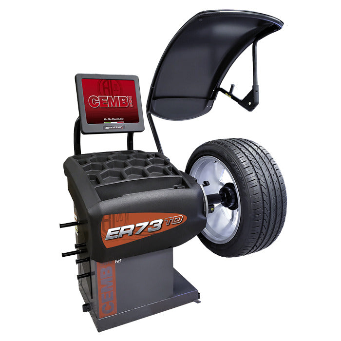The CEMB Video Touchscreen Wheel Balancer ER73TD is made especially for busy tire shops. This new series has the latest technology in wheel balancing, "Spotter" lasers that actually pinpoints the exact location of stick-on wheel weights. This is done with little or no chance of operator error when entering dimensions (major cause of check spin errors). Full Time Static on screen for a perfect balance. The automatic arm measures diameters up to 30", automatic entry of the dimensions with width sonar 3D. It comes fully assembled.A high volume, heavy-duty touchscreen wheel balancer with all the best features from CEMB including AutoAdaptive Mode and OPB (One Plane Balancing); focused on performance, ease of use, efficiency, and time savings. The unique ergonomic wheel offset improves access to the inside of commonly balanced wheels requiring tape-on weights.