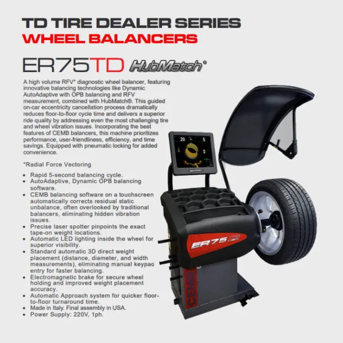 The CEMB ER75TD HubMatch Wheel Balancer with Pneumatic Clamping is a high volume RFV diagnostic wheel balancer, uniquely using advanced balancing features such as our Dynamic AutoAdaptive with One-Plane Balancing and RFV measurement combined with HubMatch. All the best features from CEMB balancers are combined with HubMatch to ensure the assembly is round when rolling on the vehicle. The ER75TD comes standard with pneumatic locking.
