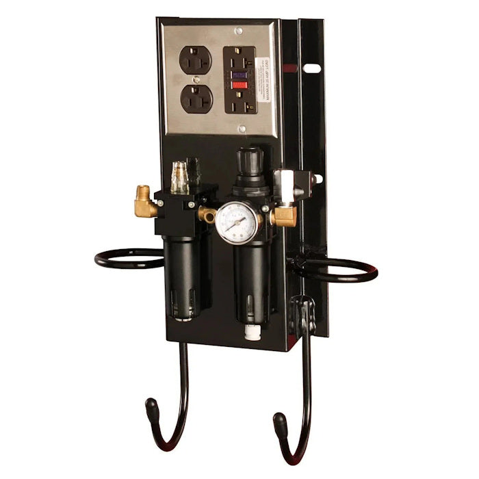 Air and Electric workstation with filter, lubricator and regulator for Challenger four post car and truck lifts. Increase productivity with air supply and electric outlets on the four post automotive lift column. Convenient power source for extension lights and other tools needed when servicing cars and trucks. Air supply will always be at arms reach for facilities using pneumatic tools such as impact wrenches.