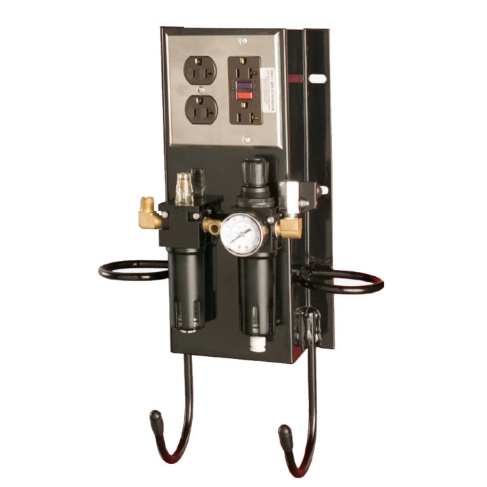 The Challenger Lifts B10264A Air & Electric Workstation with Filter, Lubricator and Regulator is for use with CL series two post car and truck lifts. Provides electricity and air mounted directly to the lift column for ultimate convenience for your technicians. Increase productivity with air supply and convenient power source for extension lights and other tools needed when servicing cars and trucks. Air supply will always be at arms reach for facilities using pneumatic tools such as impact wrenches.