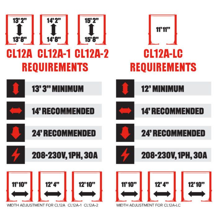 - Bay Height: 13' 3" Minimum (12' Minimum for CL12A-LC)