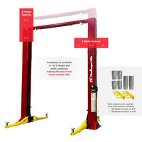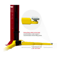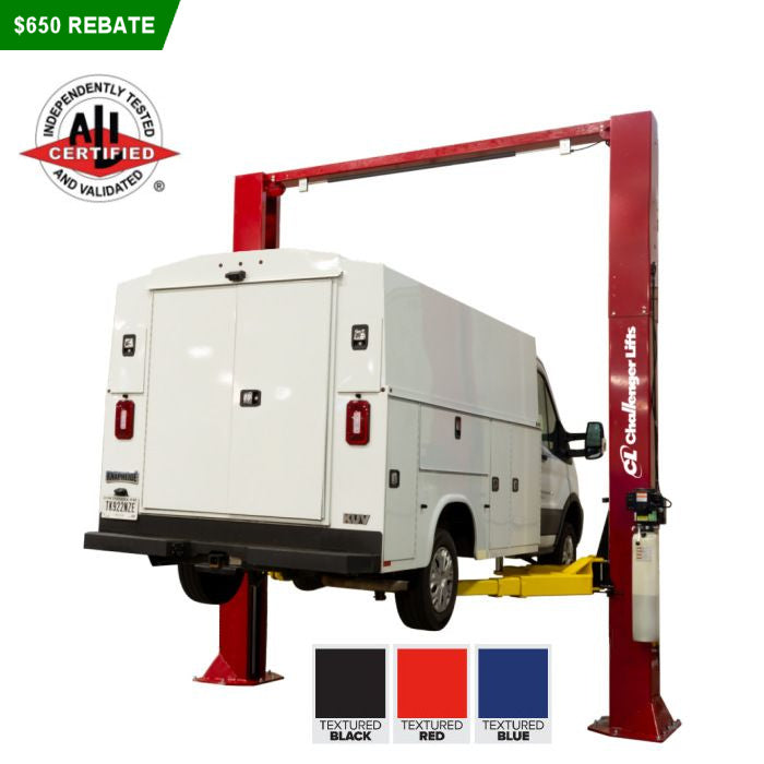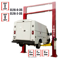 Challenger Lift's CL16-0-3S Heavy-Duty Two Post Lift boasts optimum flexibility with a lift designed from the anchors to meet ALI/ANSI safety standards. These lifts have a capacity of 16,000 lbs. and can lift everything from compact cars to tall, heavy trucks. Altogether, this lift will withstand the toughest of fleet maintenance needs. The CL16-0-3S has the capacity and height to symmetrically lift service trucks and 3-stage front and rear arms to lift smaller vehicles asymmetrically. Additionally, featuring low-profile pickup pads and an adjustable width and height. 2ft height extensions are available for additional clearance. Challenger Lifts CL16-0-3S is ALI and ETL Certified.